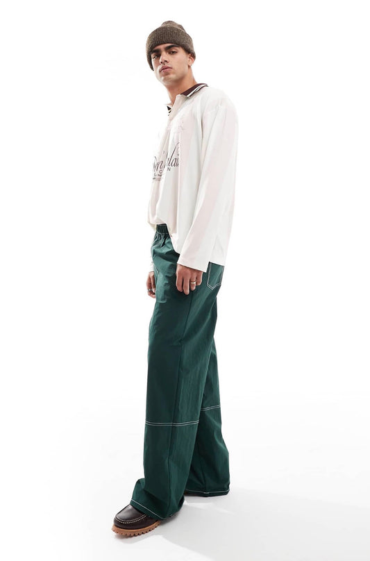 ASOS DESIGN baggy trouser in green nylon with contrast stitch