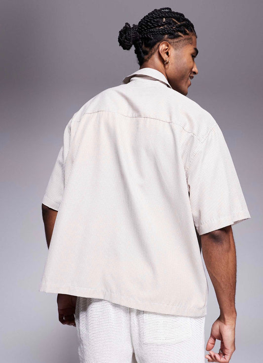 ASOS DESIGN boxy oversized check shirt with chest embroidery in beige