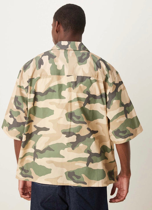 ASOS DESIGN boxy oversized shirt with chest embroidery in camo print