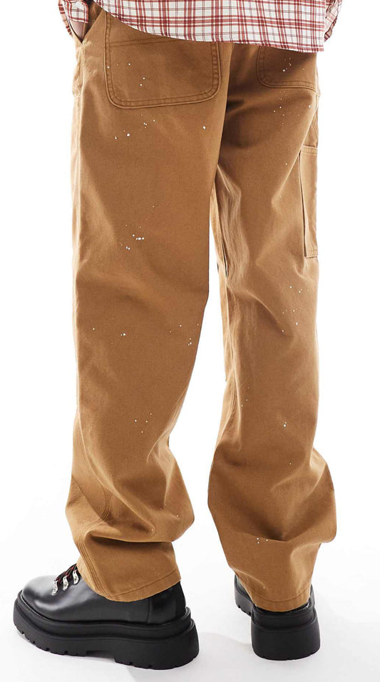 ASOS DESIGN carpenter trousers with paint splats in tan