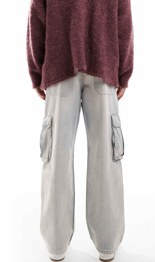 Pull&Bear heavy washed wide leg cargo jeans in light blue