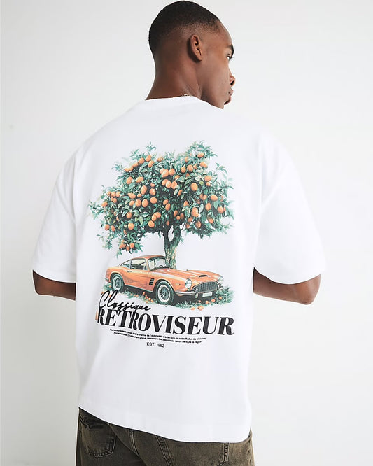 River Island Mens T-Shirt White Retroviseur Orange Tree Car