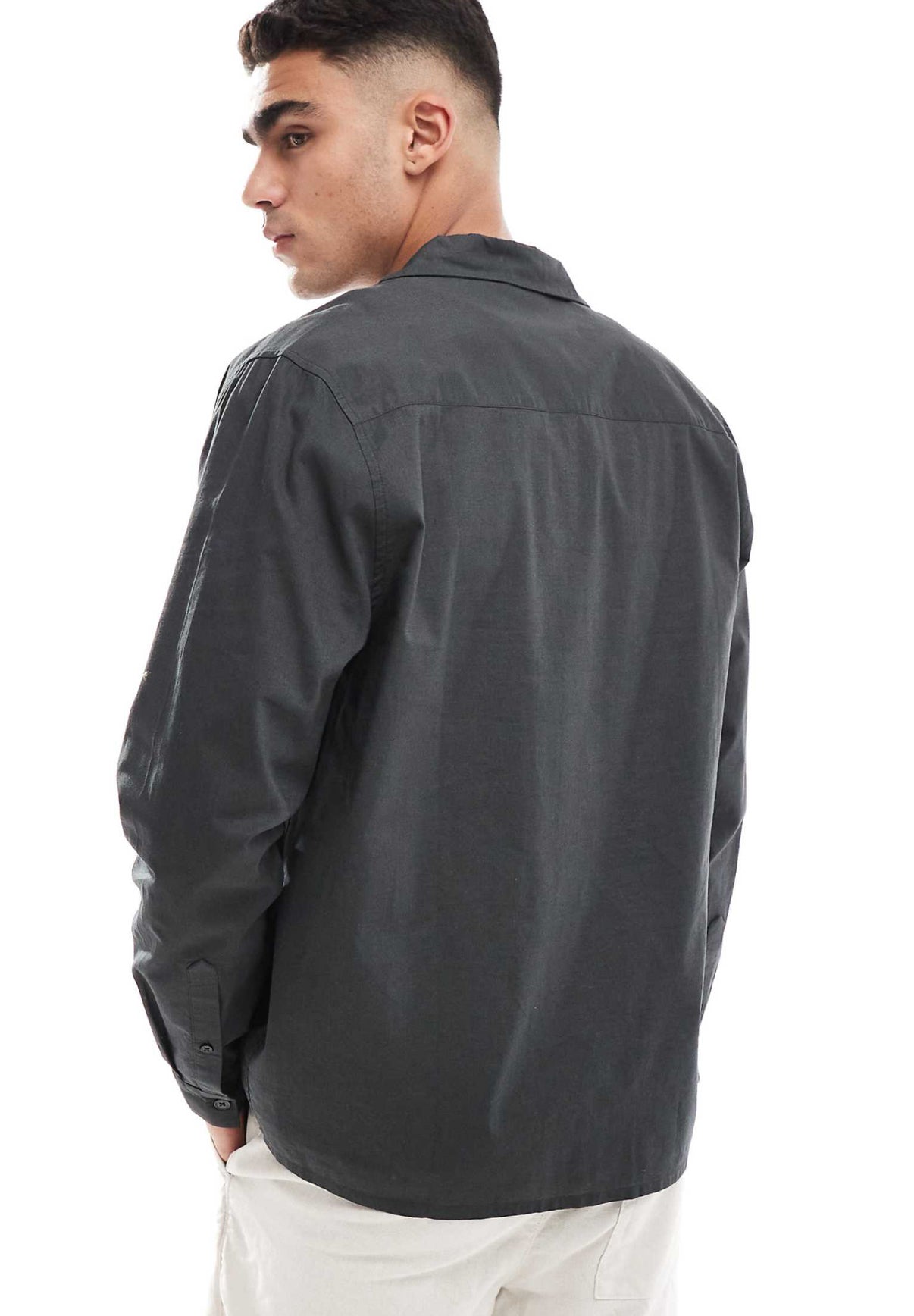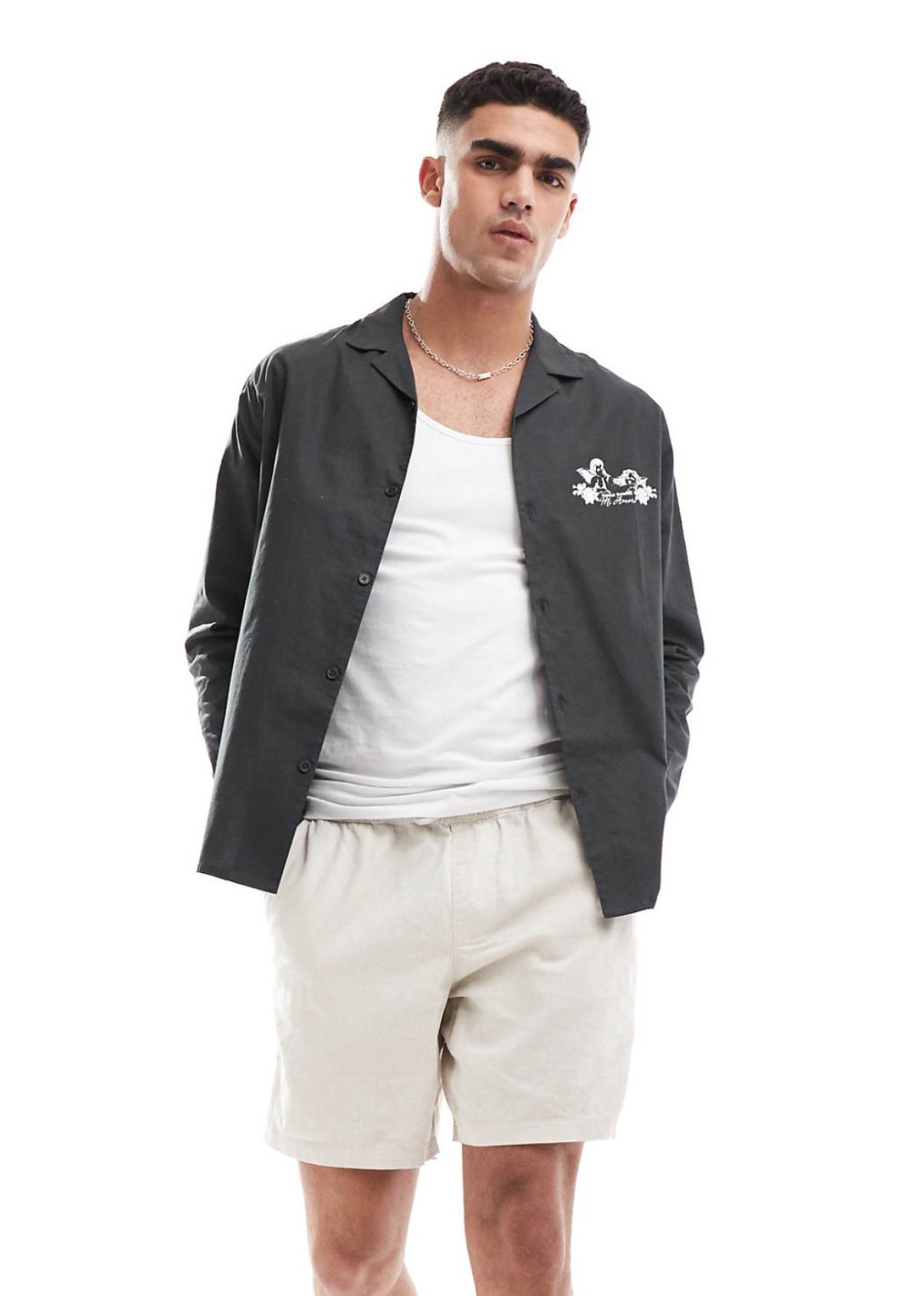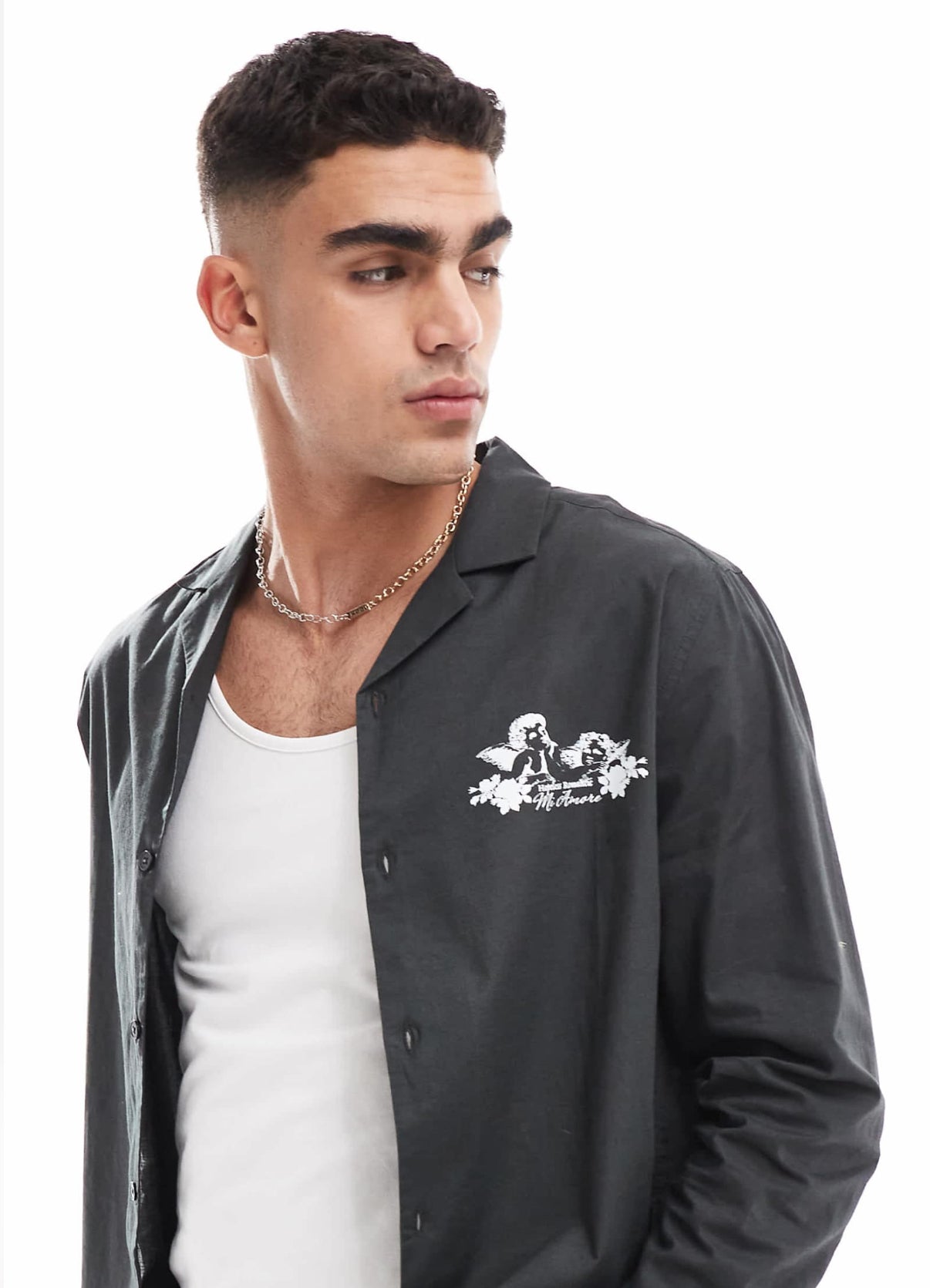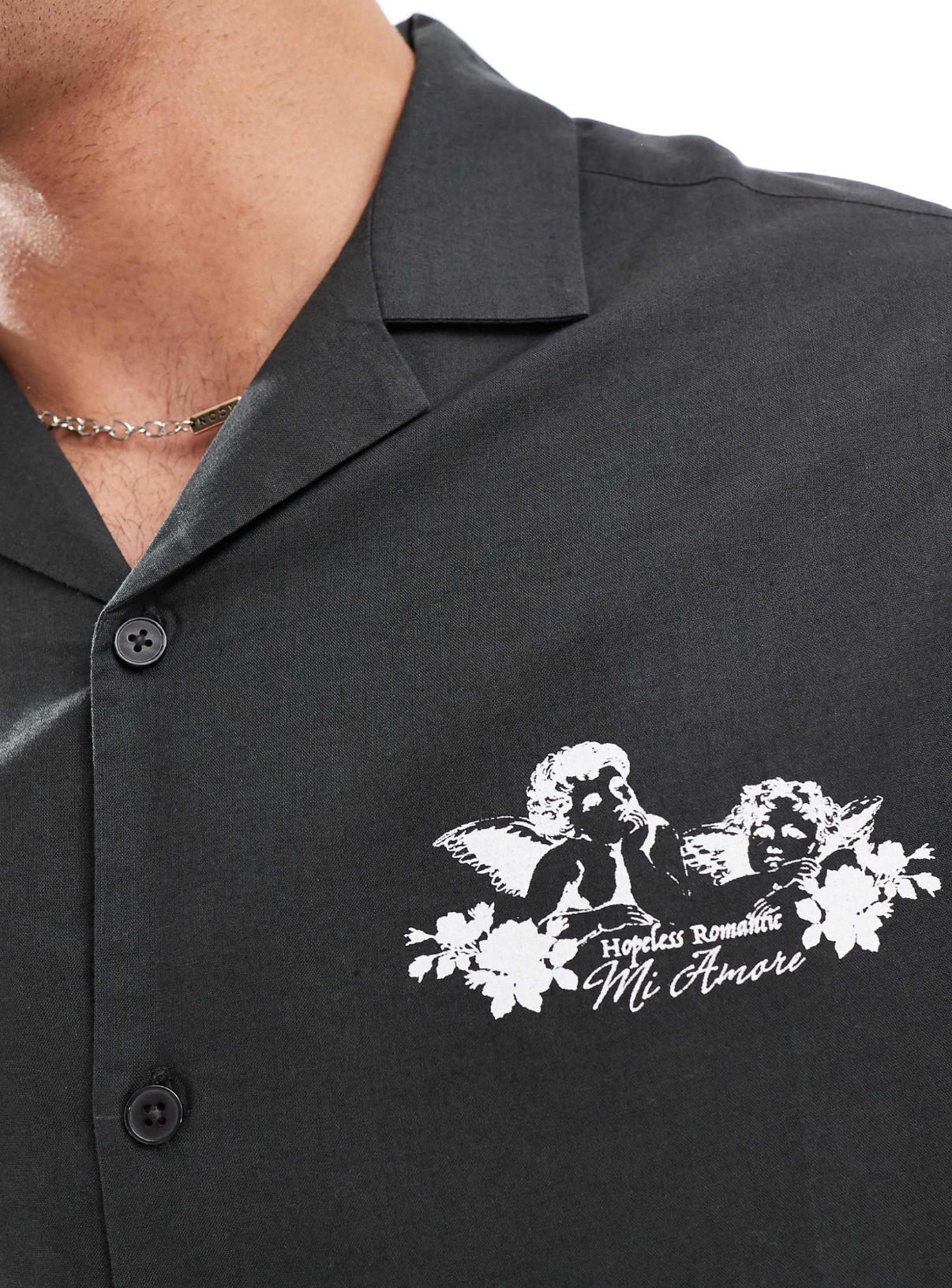 ASOS DESIGN relaxed revere shirt with cherub placement print in charcoal