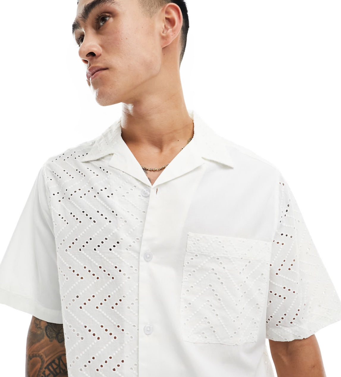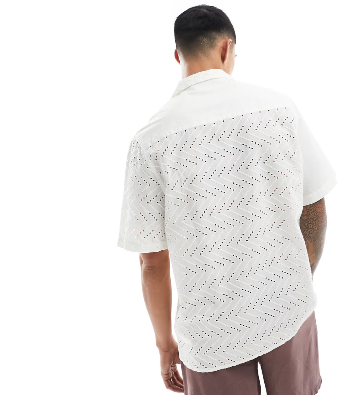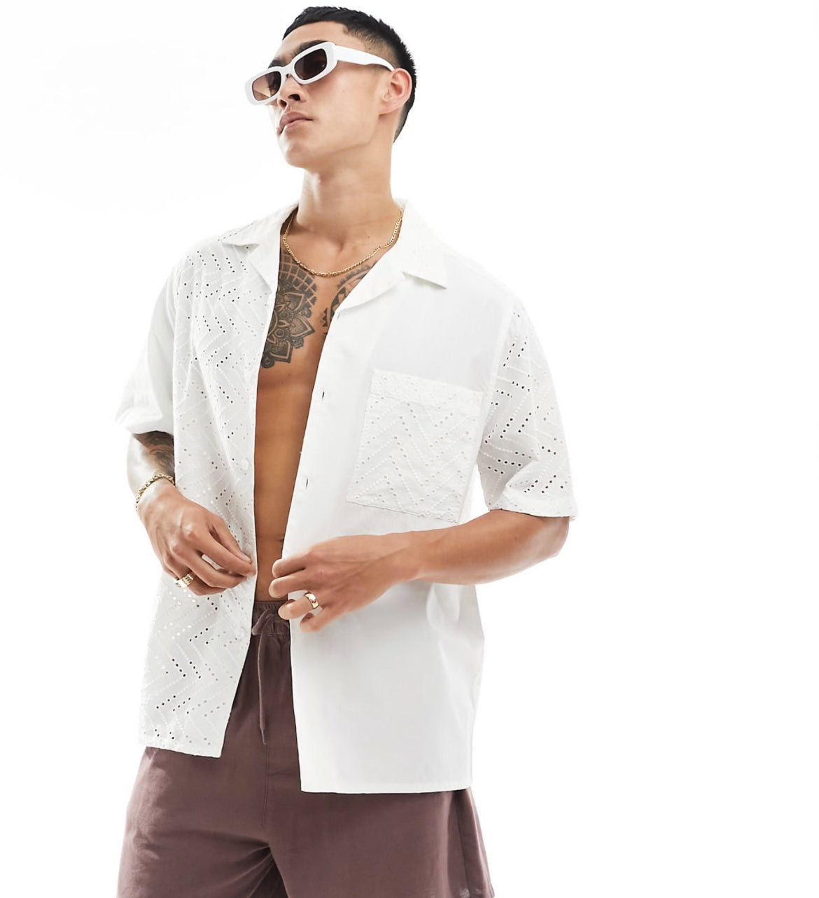 ASOS DESIGN short sleeve relaxed revere broderie shirt in white