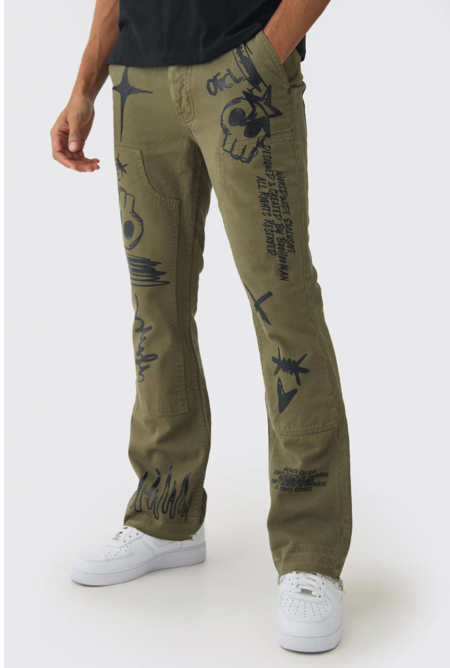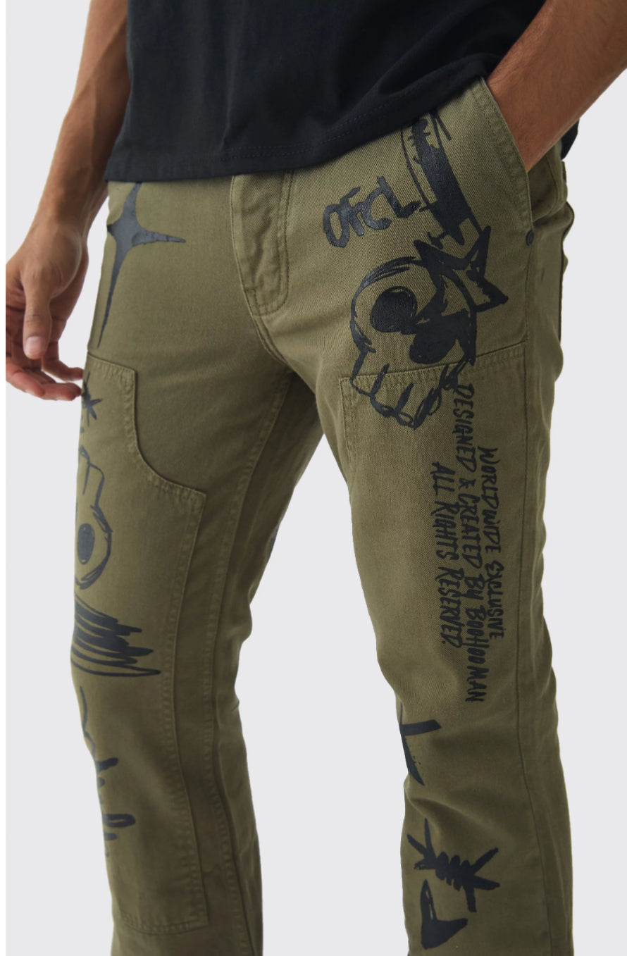 BoohooMan Fixed Waist Slim Flare Twill Laser Printed Carpenter Trousers