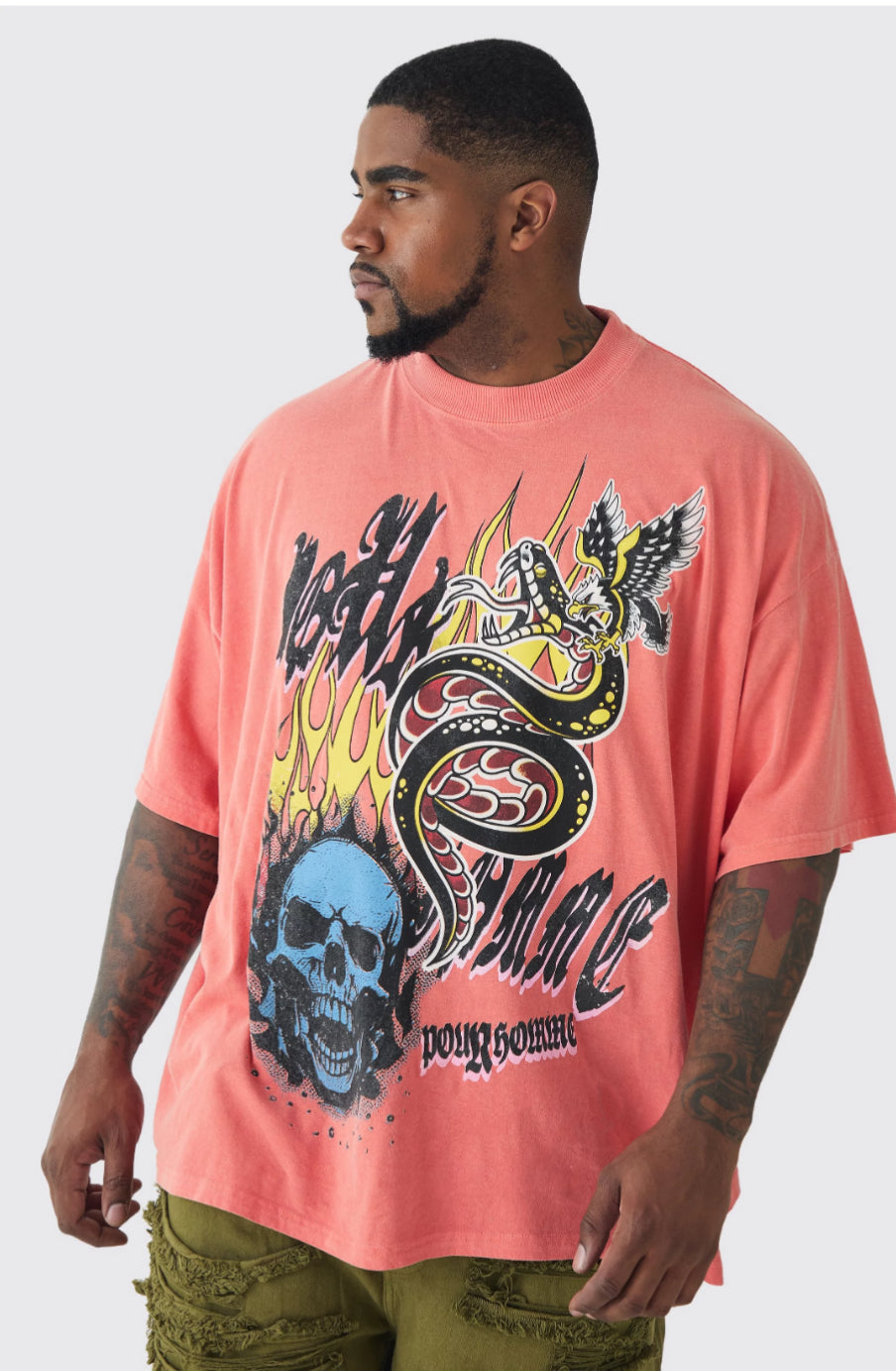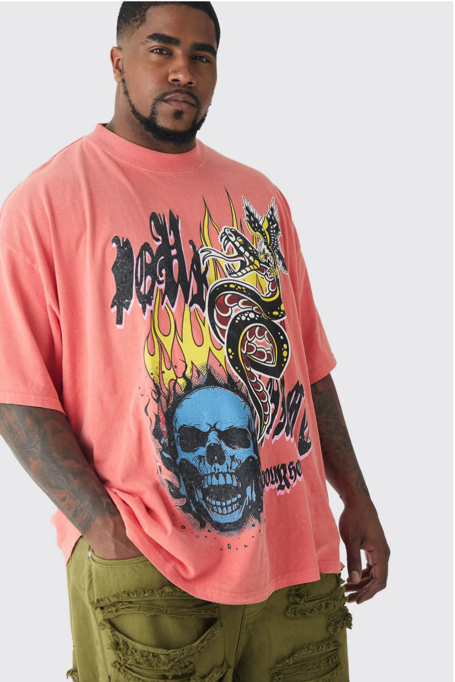 BoohooMan Plus Doodle Skull Homme Printed T-shirt In Coral
