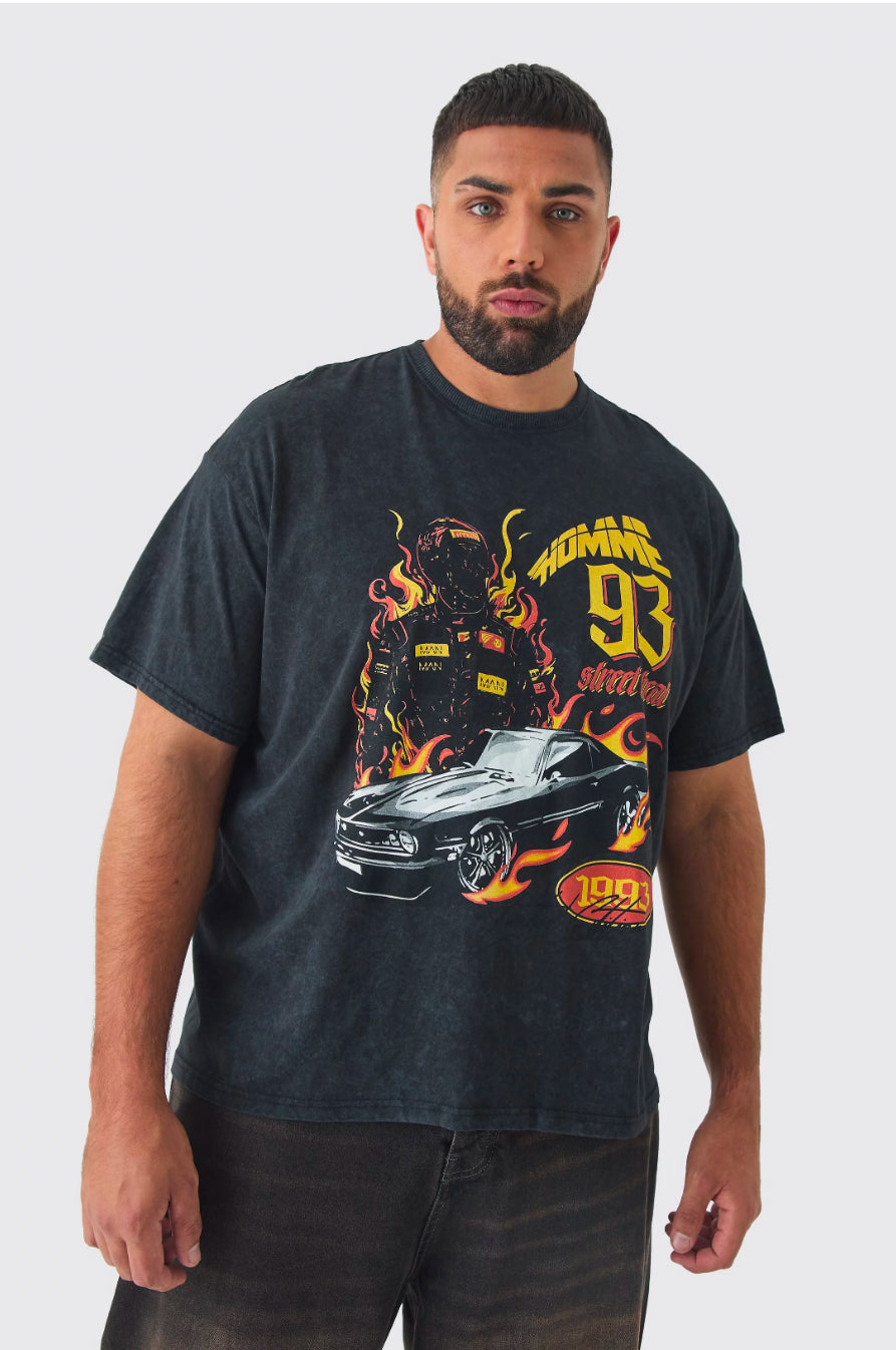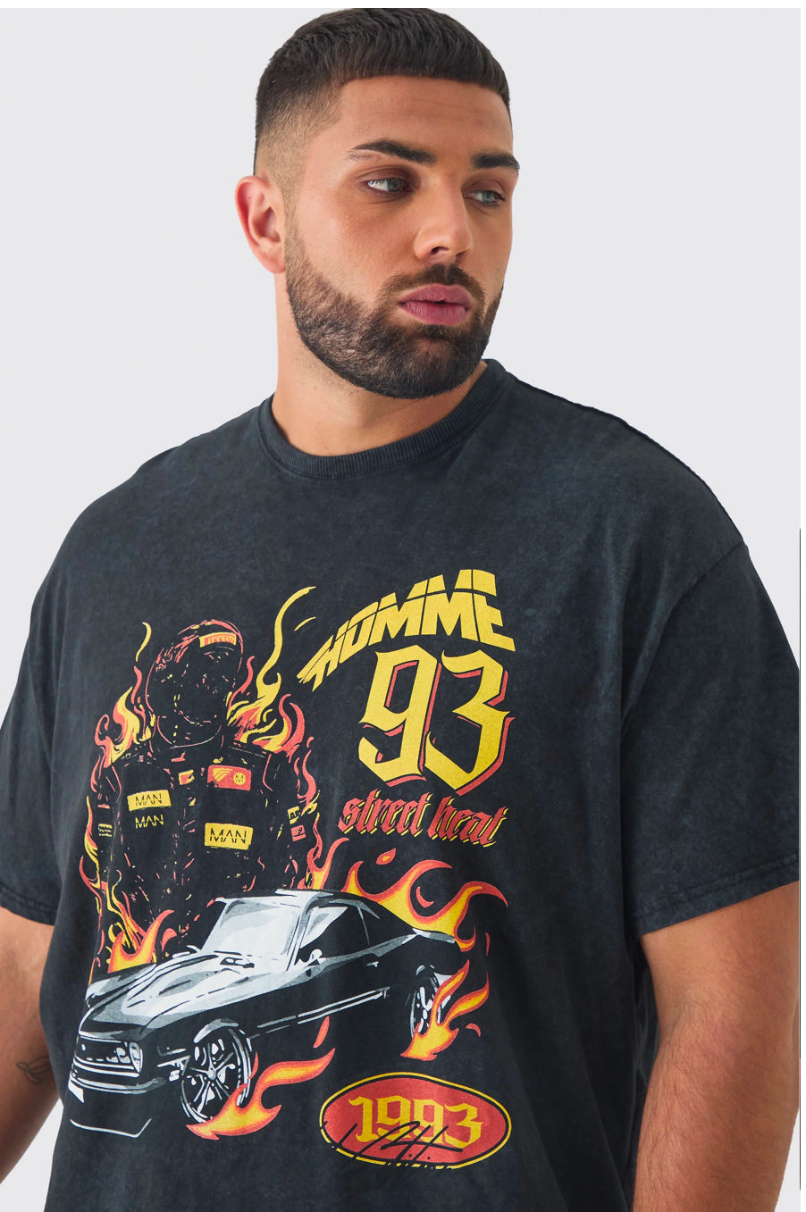 BoohooMan Plus Oversized Acid Washed Moto Print T-Shirt