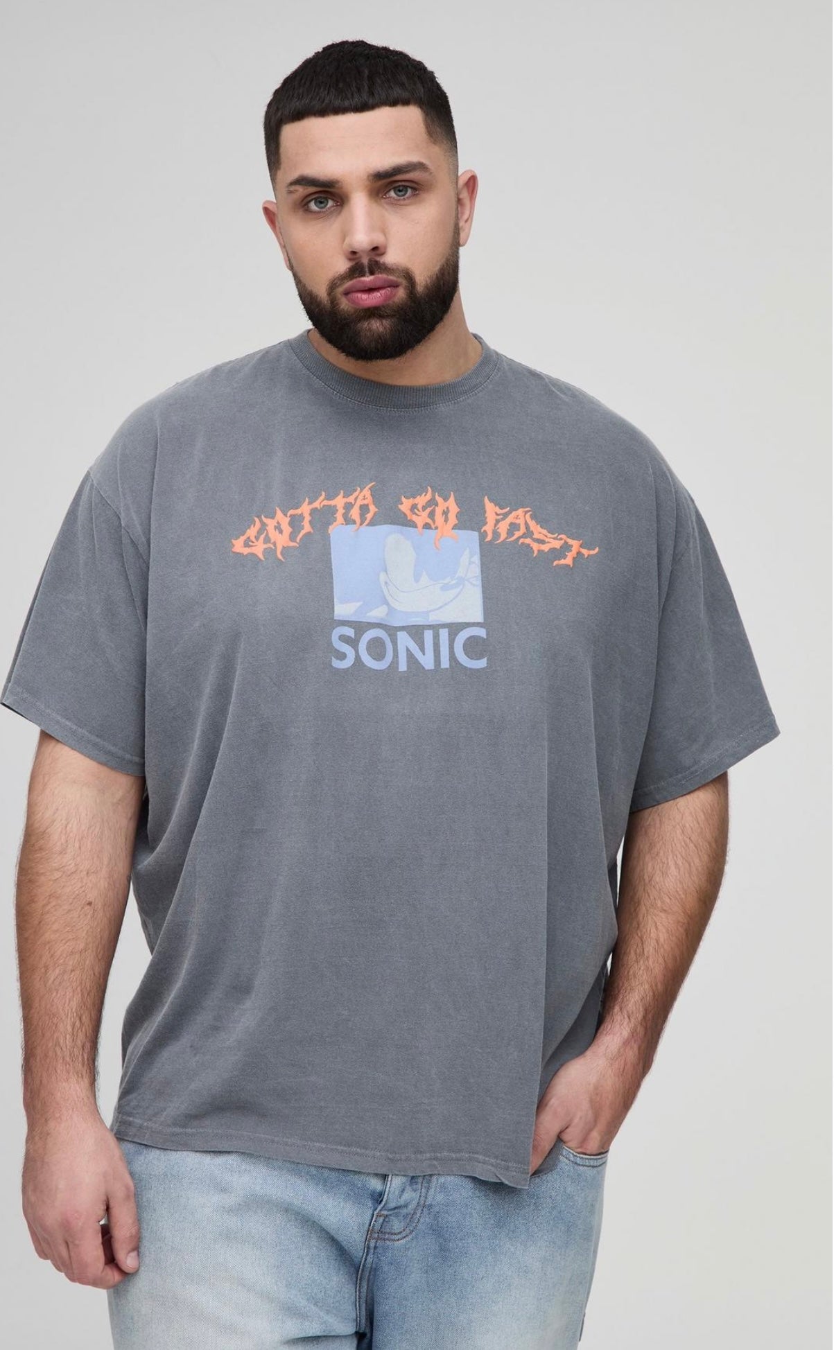 BoohooMAN Plus Sonic Licence Washed T-Shirt In Grey
