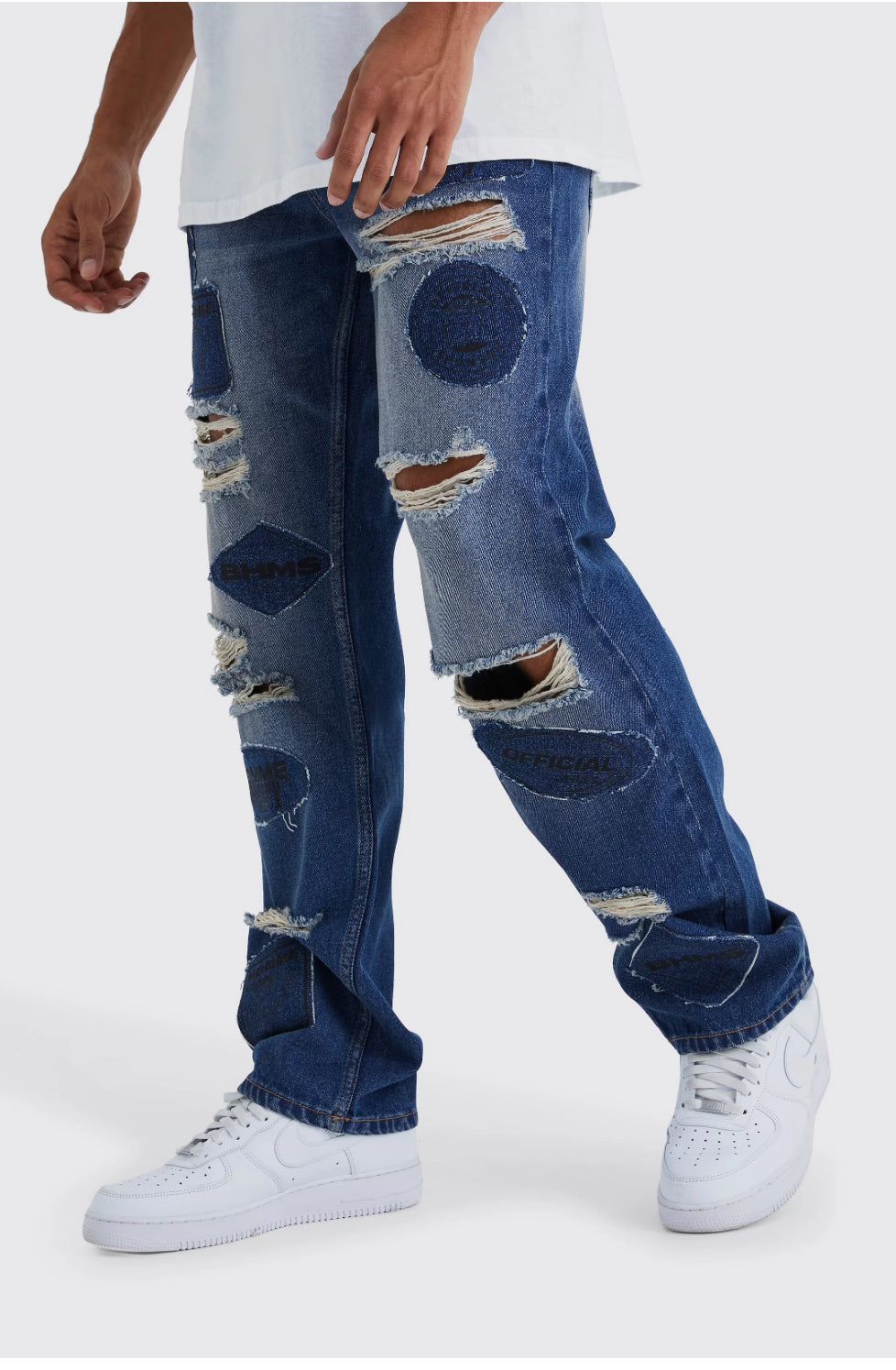 BOOHOOMAN RELAXED RIGID APPLIQUE RIPPED JEANS
