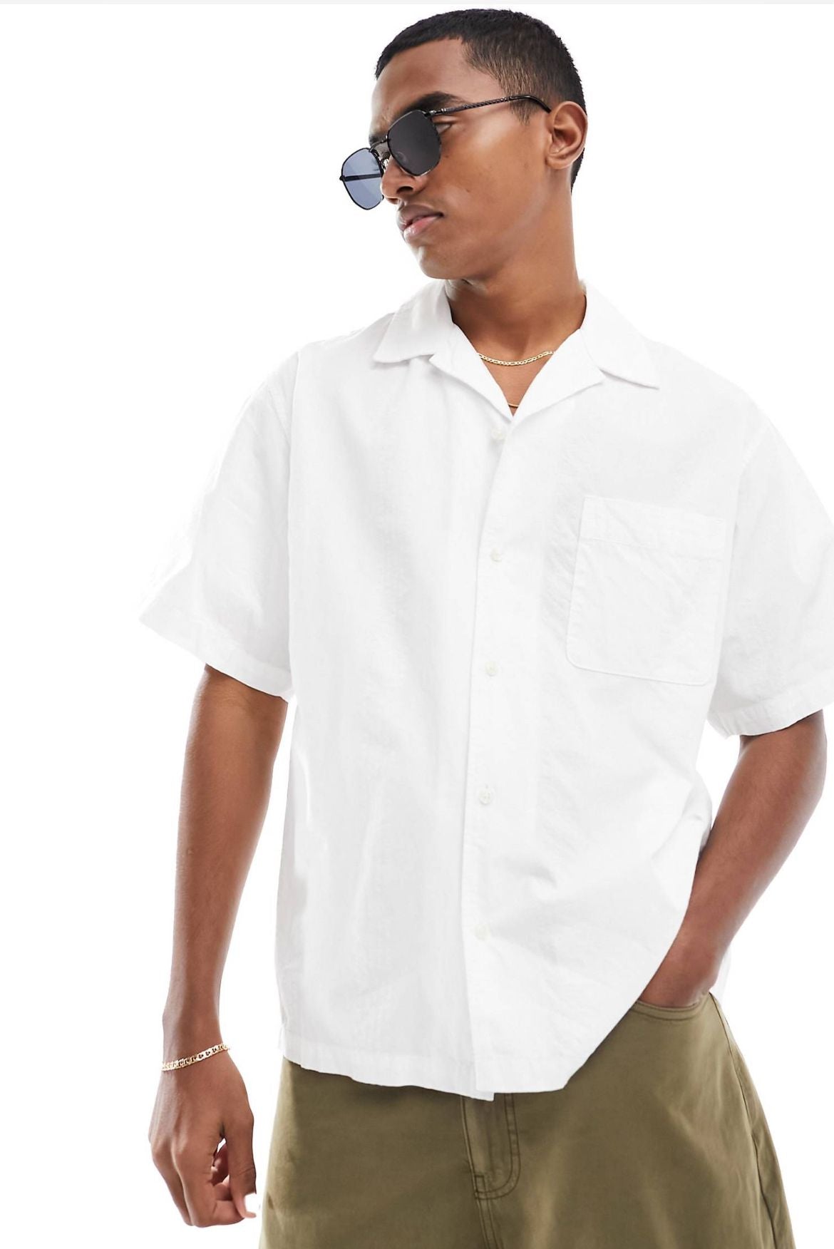 Selected Homme boxy oversized revere collar seersucker shirt in white