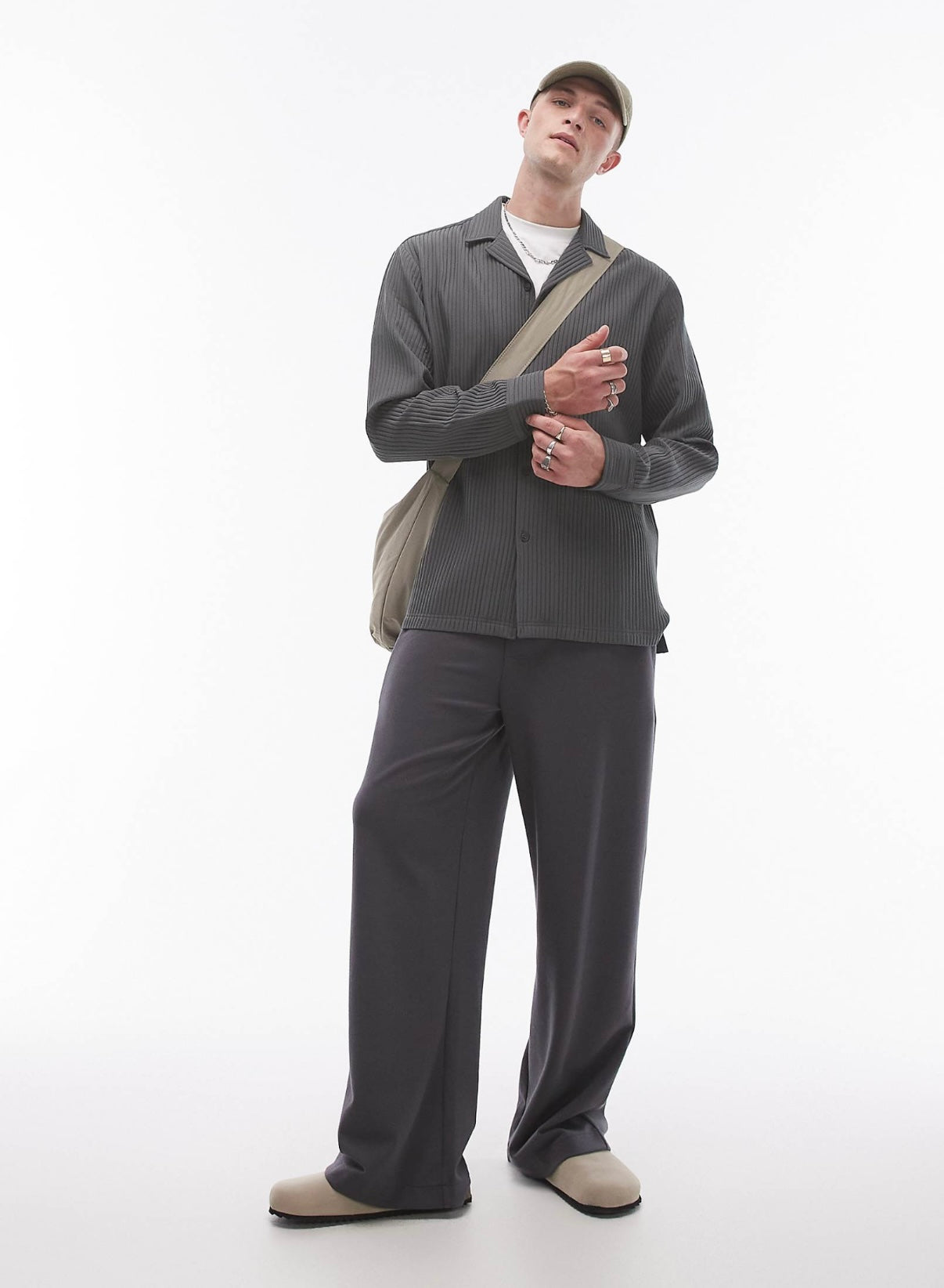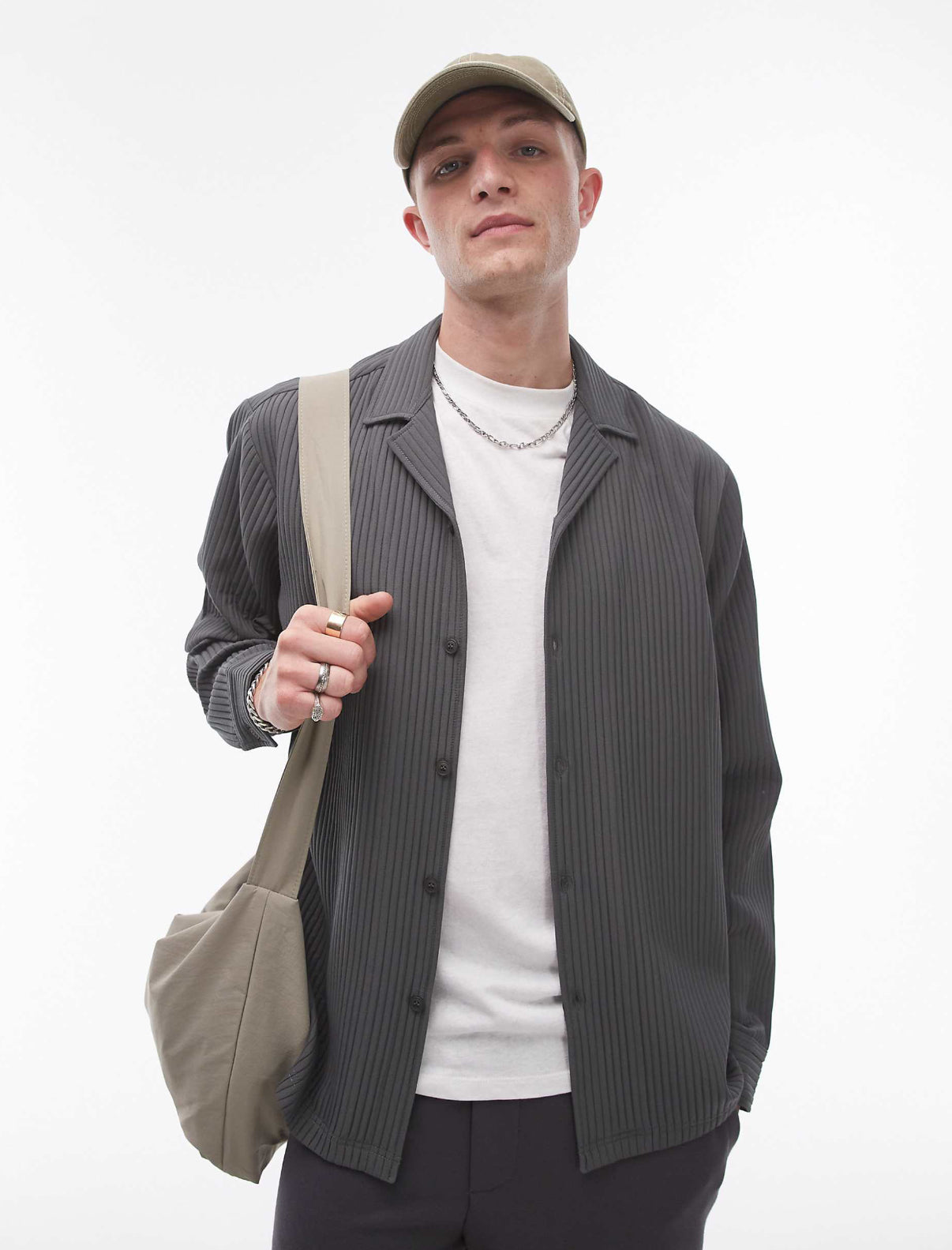 Topman long sleeve regular fit revere plisse shirt in charcoal