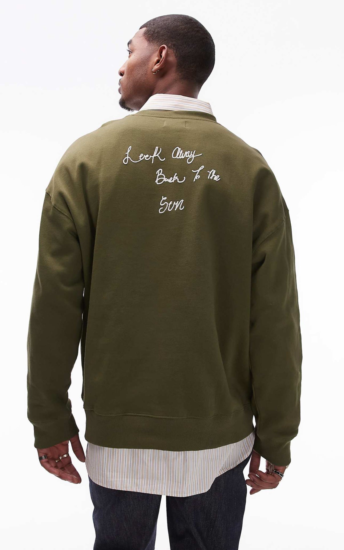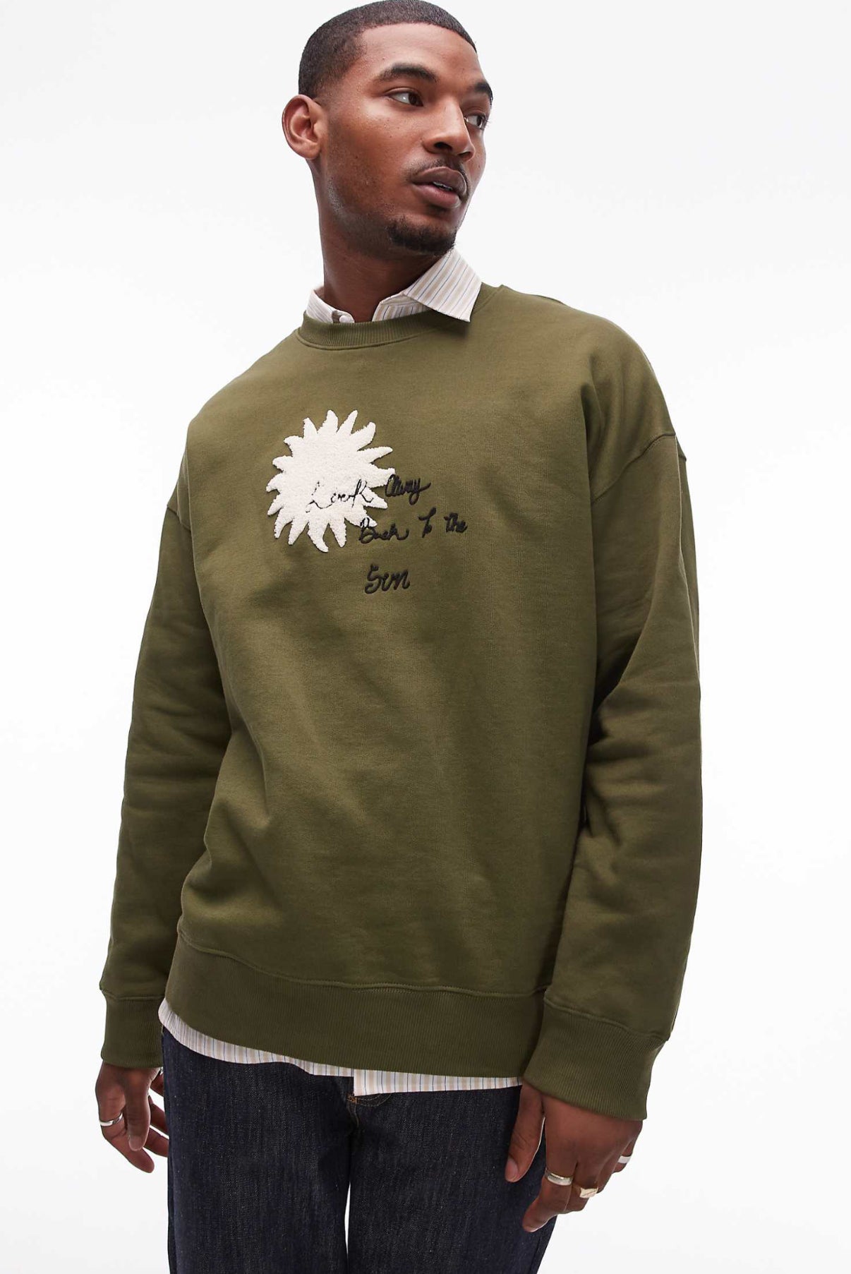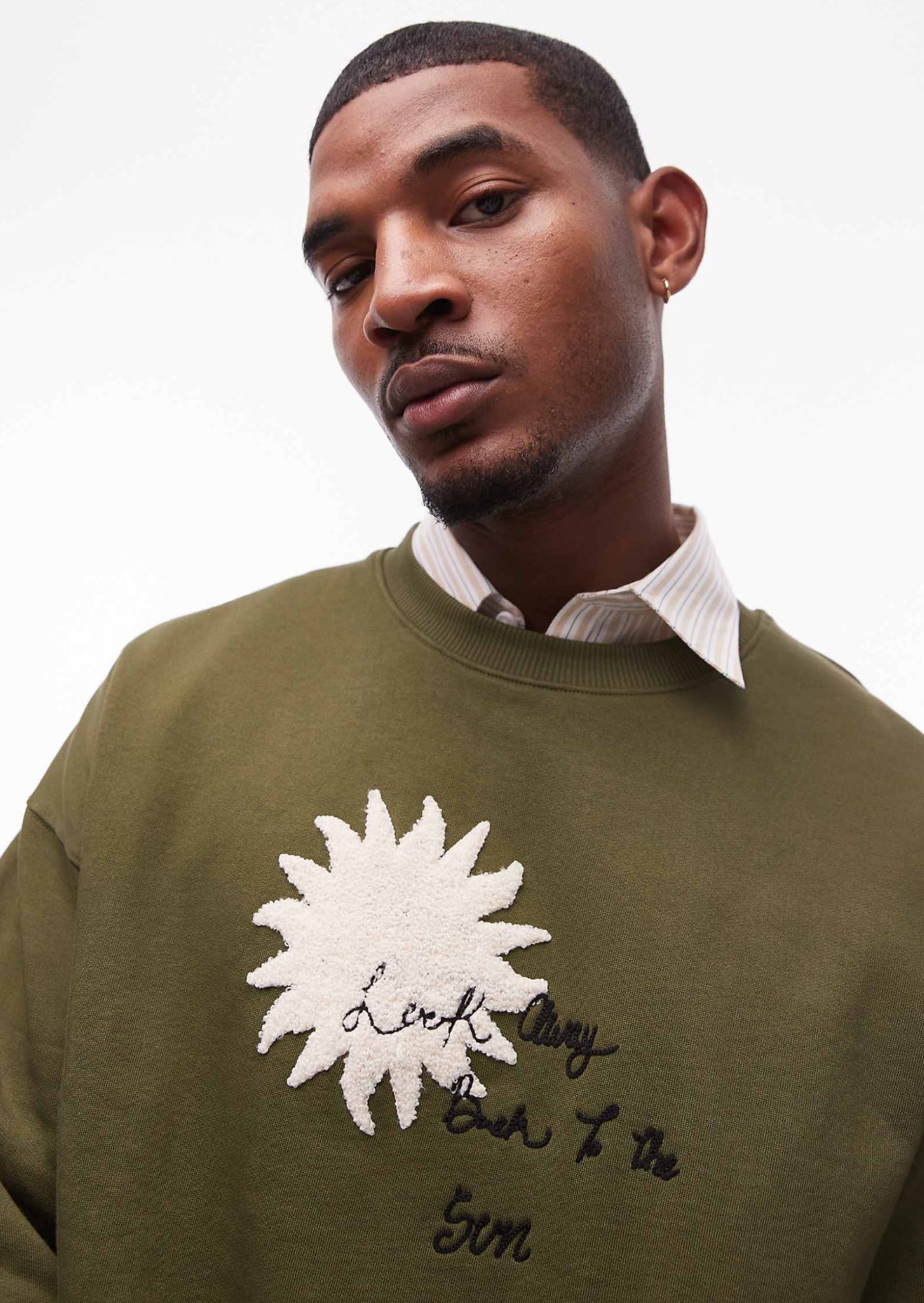 Topman oversized fit sweatshirt with front and back sun and words chenille embroidery in khaki